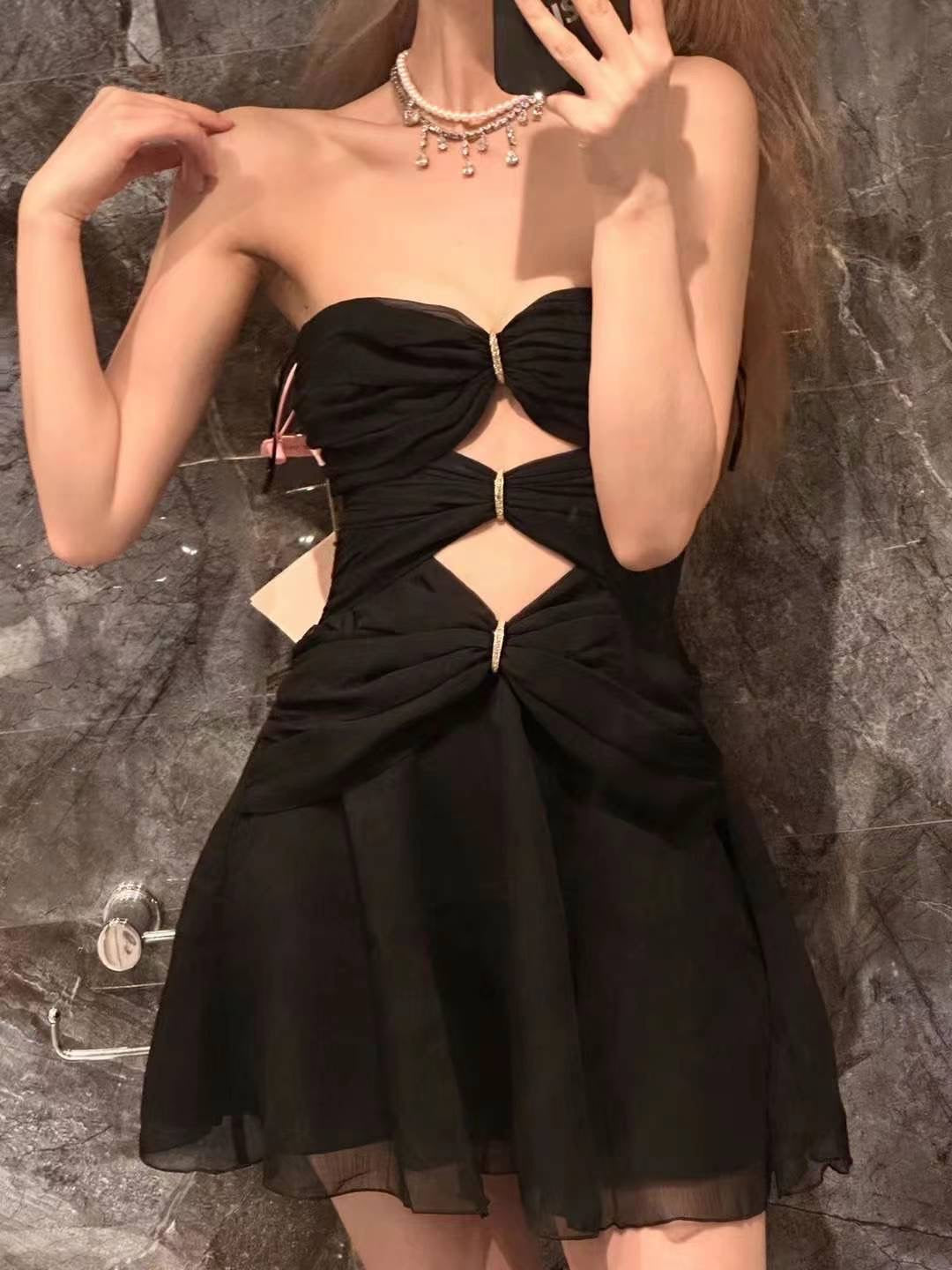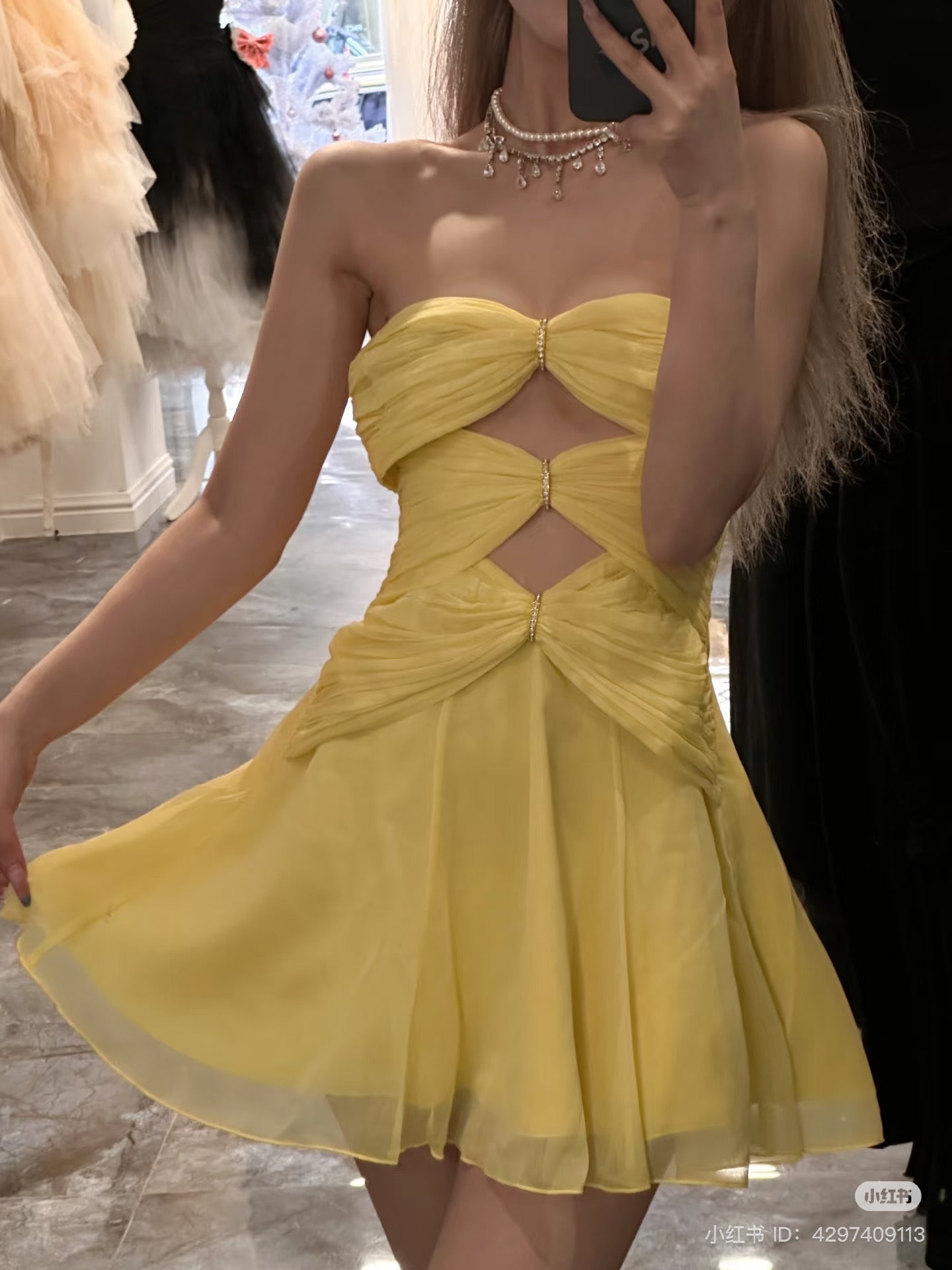 Designed with luxurious fabric, the exterior features a textured surface, gracefully swaying in the sunlight. Featuring a meticulously crafted three-pinch design on the front panel, this dress shapes an elegant curve that beautifully enhances the wearer's silhouette. Adorned with NJ customized golden rings, it adds a touch of glamour and sophistication to the ensemble.